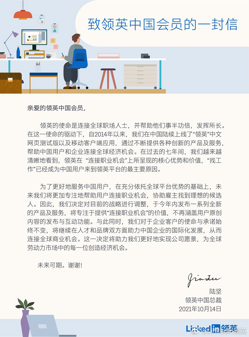 早在今年10月14日,微软便表示过会停止LinkedIn在中国使用,到时候会推出一个招聘产品取代。