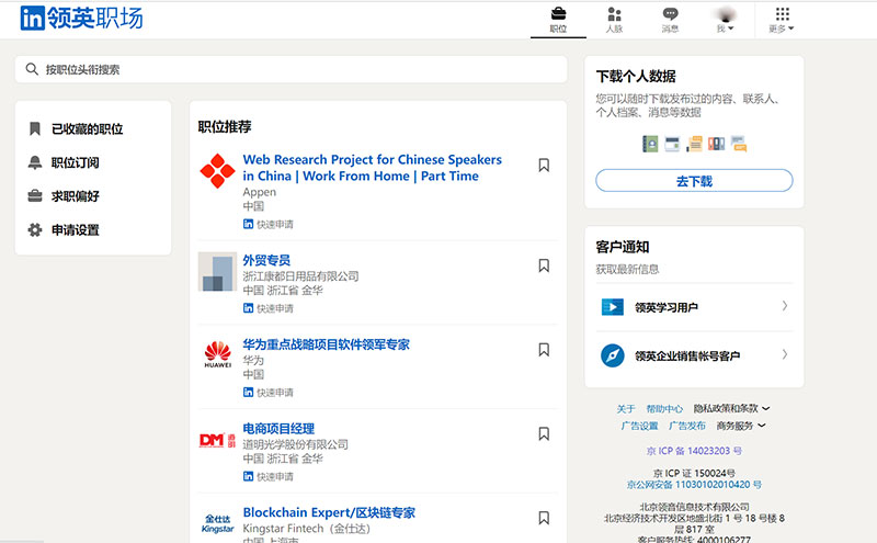 领英对外贸人的影响比较大,因为不少外贸人都是从领英上挖掘客户的。领英上有不少海外高管和领导人,也最有利于寻找到关键决策人客户。如果国内只能登录领英职场,只能看到国内岗位的招聘信息,再也无法联系到海外客户,无疑损失巨大。